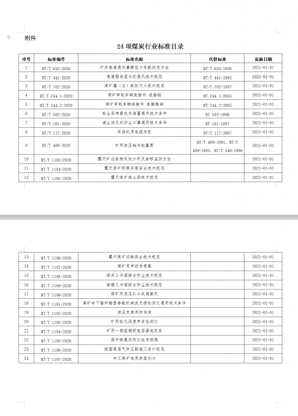國家煤礦安全監(jiān)察局批準24項煤炭行業(yè)標準(目錄見附件),自2021年1月1日起施行,現(xiàn)予公告。